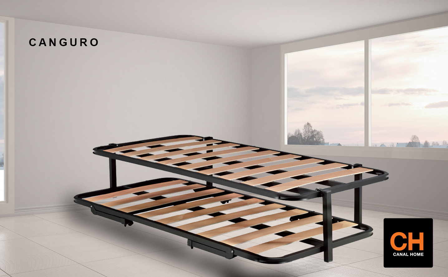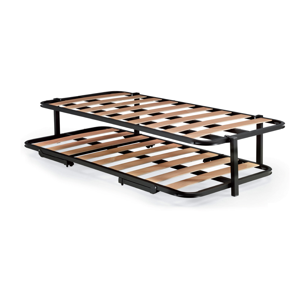 Canguro o cama nido con dos somieres que sirve de base para cualquier colchón, incluso los de latex, aprovechando el espacio inferior para mantener plegado el somier inferior cuando no se utiliza.